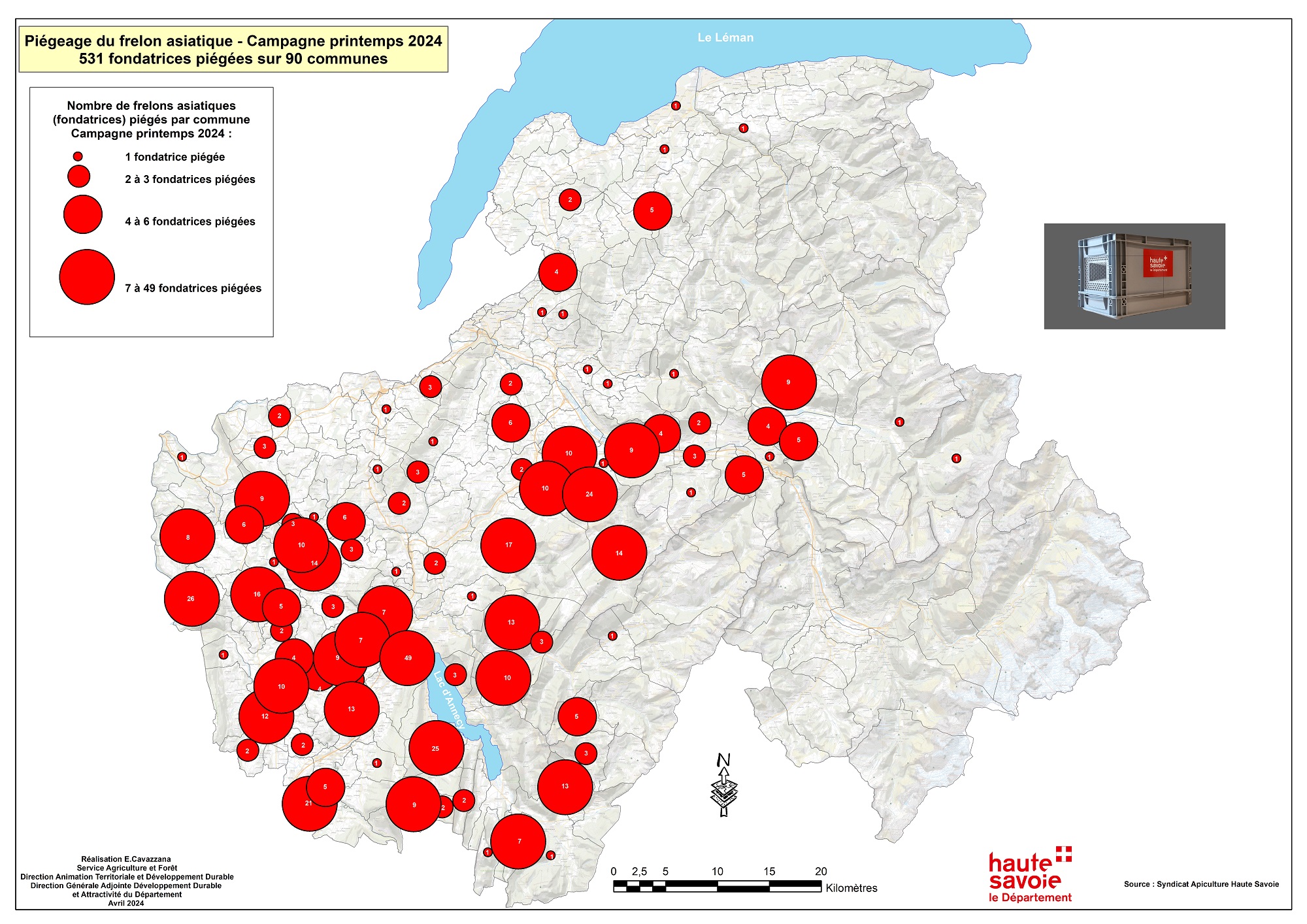 La campagne de piégeage qui s’effectue en deux temps est toujours en cours jusqu’à la fin du mois de mai malgré une météo défavorable (pour piéger les fondatrices dans les zones de butinage de façon à éviter la création de nids). Elle reprendra ensuite à l’automne (pour piéger les ouvrières en zones de forte concentration de l’insecte ou à proximité des ruchers pour protéger ces derniers des attaques). Avec le redoux annoncé, l'activité des frelons asiatiques va s'intensifier et le rythme des captures devrait s'accroître. Pour l’heure déjà 531 fondatrices ont été capturées dans 90 communes de Haute-Savoie.
