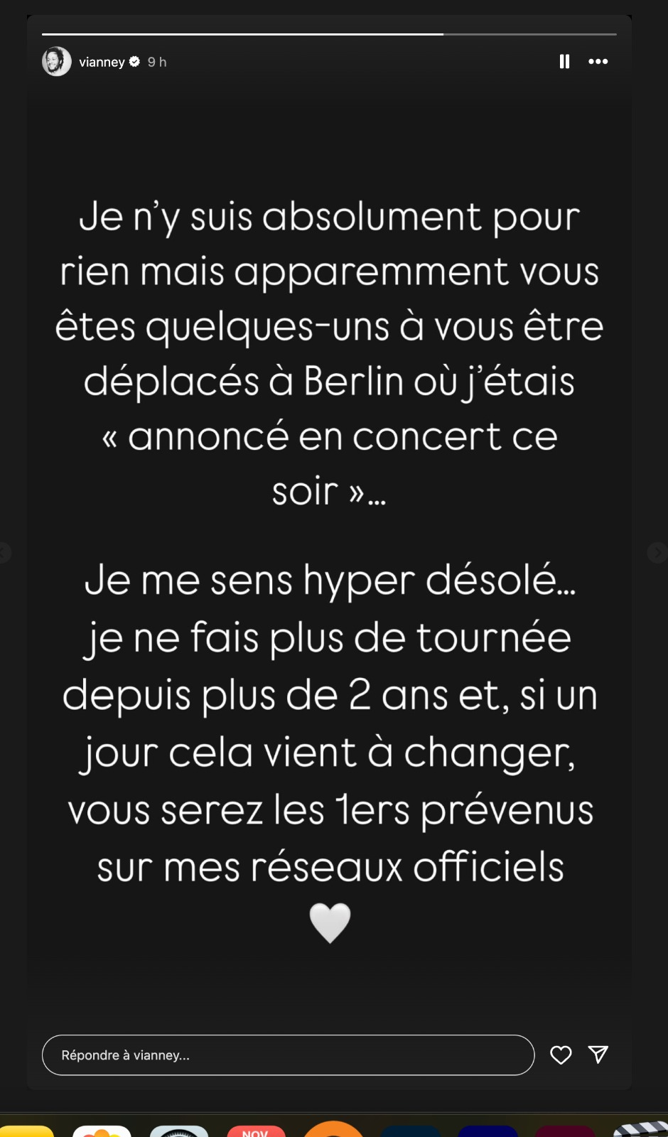 Il poursuit en ajoutant : "Je me sens hyper désolé... je ne fais plus de tournée depuis plus de 2 ans et, si un jour cela vient à changer, vous serez les premiers prévenus sur mes réseaux officiels."